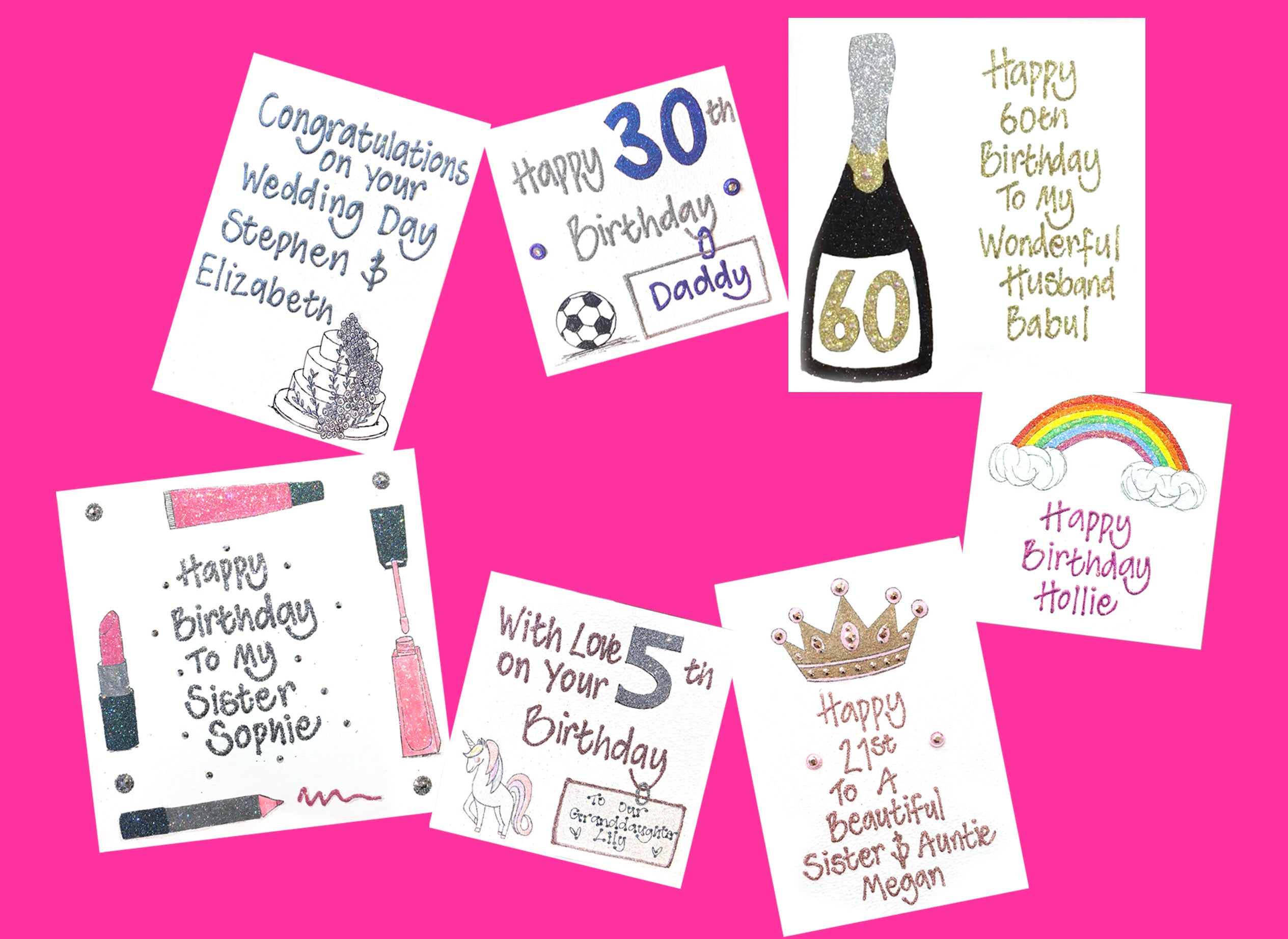 Our personalised products are made bespoke for you as keepsakes so that they can be treasured for years to come. Made for you, created by us, our glittery handcrafted cards can be personalised with any message for any occasion. We have an array of other personalised items that include but are not limited to balloons, banners, sashes, plaques. badges, glasses, guest books and more. We are also however open to unique custom orders if you have a specific request.